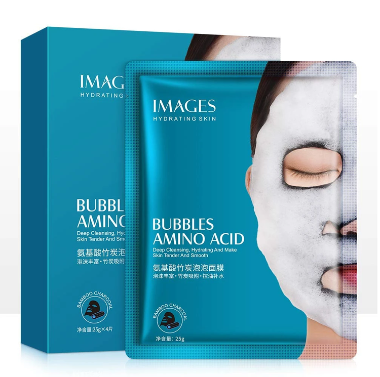 ماسک ورقه ای حبابی آمینواسید ایمیجز IMAGES این ماسک حبابی عجیب و غریب که با زغال فعال فرموله شده است، منافذ را فورا تمیز و پوست را لایه برداری و باز می کند تا از ایجاد انسداد منافذ و تولید آکنه و جوش های سرسیاه جلوگیری کند و آن هارا با از بین بردن سلول های مرده پوست و حباب زدن و رفع کثیفی و سبوم مسدود کننده منافذ از بین می برد. ماسک ورقه ای حبابی آمینواسید ایمیجز غنی از آمینو اسید است و باعث جوانسازی و رطوبت رسانی بیشتر به پوست شما می شود و لایه های عمیق پوست را مرطوب می کند.