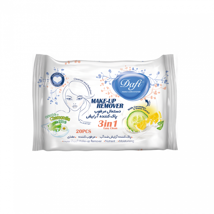 یکی از راههای مراقبت پوست و داشتن پوستی زیبا و شفاف، پاک کردن آن از مواد آرایشی و آلودگیهای روزمره است. دستمال مرطوب پاککننده آرایش دافی یک پاککننده مواد آرایشی ضدآب، مرطوبکننده و تغذیهکننده پوست بوده و به همین جهت نام آن را به نام سه در یک اختصاص دادهاند. این محصول حاوی مواد مغذی، عصارههای آلوئهورا، بابونه، لیمو و خیار بوده که سبب حفظ لطافت و شفافیت پوست میشوند. از نکات بسیار مثبت در تولید این دستمال معطر میتوان به فاقد الکل، پارابن و صابون بودن آن نیز اشاره کرد.
