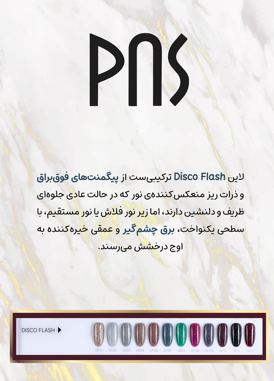 لاک ژل DISCO FLASH پی ان اس ارائه شده در 12رنگ.