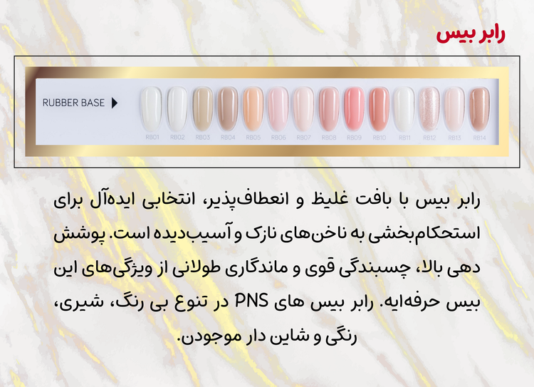 رابر بیس پی ان اس رابر بیس: یک لایهی پایه برای لاک ژل به حساب میاید. دارای خاصیت ارتجاعی انعطاف پذیر بدون شکستگی به راحتی خم میشود افزایش مقاومت ناخن در برابر شکستگی دارای غلظت مناسب و بافت یکدست در ۱۶ رنگ ارائه شده است.