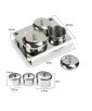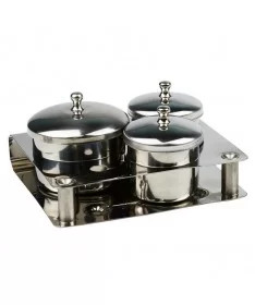 این محصول از یک سینی پایه دار در ابعاد 10*12 برای قرار گرفتن 3 ظرف استیل در 2 سایز تشکیل شده است.2 ظرف کوچک تر این محصول دارای قطر 4.5 سانتی متر و ارتفاع 3.5 سانتی متر و سایز بزرگ تر آن قطری برابر 6 سانتی متر و ارتفاع 3.5 سانتی متر دارد. روی سینی این محصول جای یک عدد قلم هم طراحی شده است.